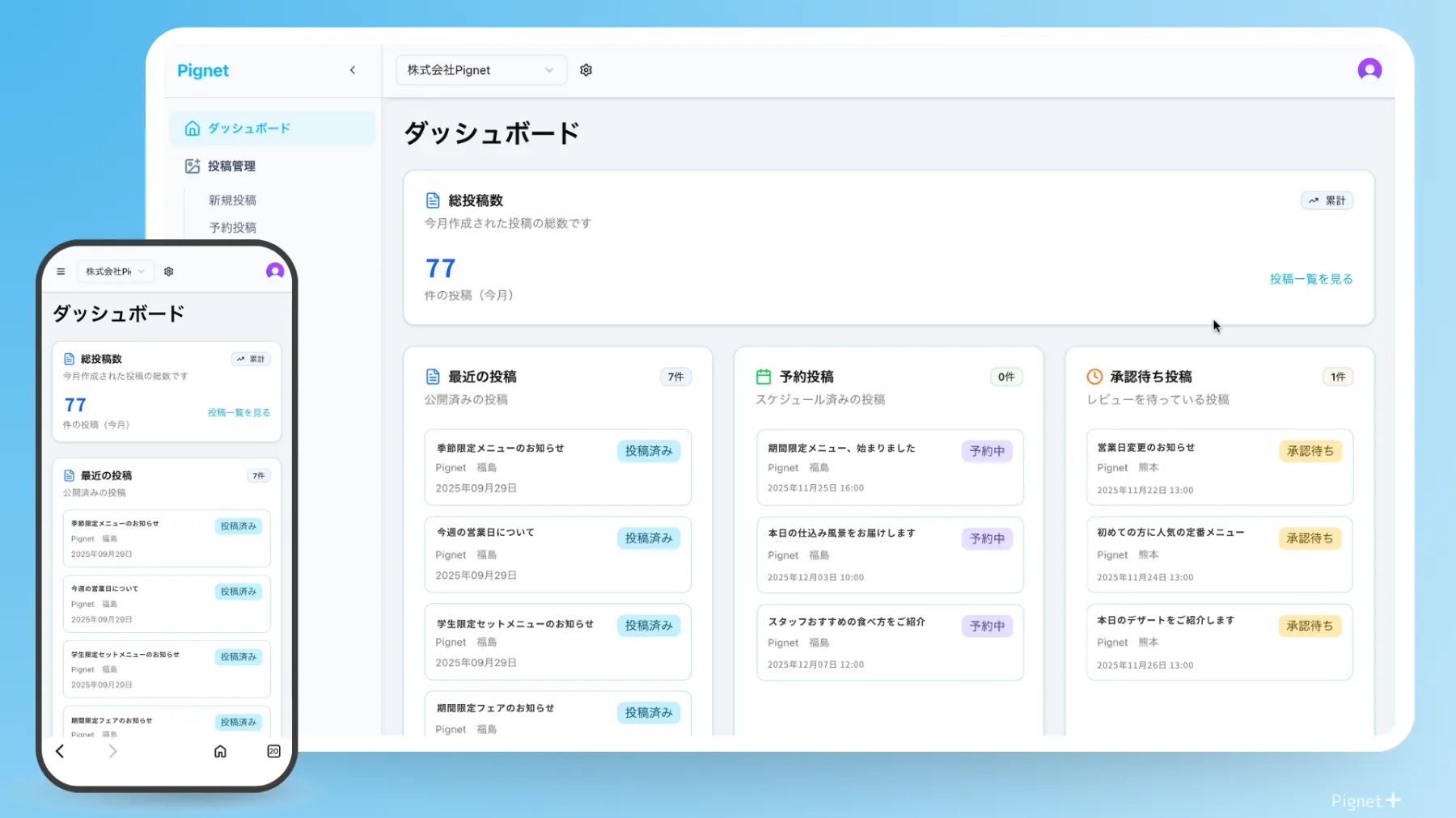 Pignetプラスの使い方を、操作画面とともに分かりやすくまとめています。初期設定から投稿まで、このページでサービスの流れを一度に把握できます。